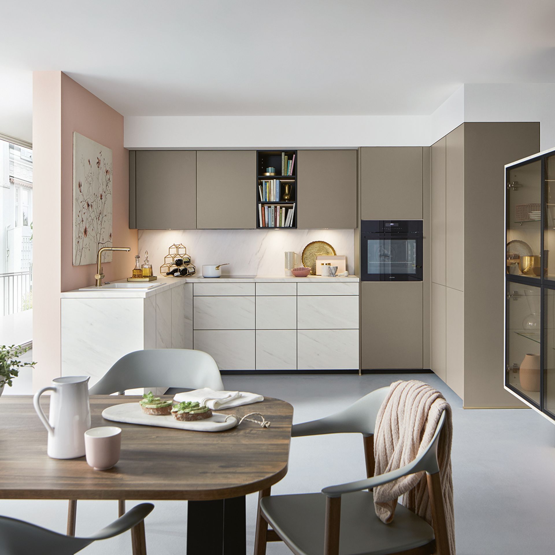 Wie sieht die Küche in den 2020-er Jahren aus? Eines ist klar: Sie ist offen für Neues. Offenes Wohnen ist so aktuell wie nie zuvor, und die einzelnen Lebensbereiche verschwimmen. In der Küche wird gearbeitet, gustiert und gekostet, auch gegessen, gechillt und verweilt. Das nicht mehr so wie vor einigen Jahren meist in klinischem Weiß, sondern in eher dunkleren Tönen. Dabei reicht der Bogen von Anthrazit über Mitternachtsblau und Tannengrün bis zu dunklen Hölzern, in die sich immer wieder ein neuer, leichter Rosé Ton mischt und für frischen Wind sorgt. Diese Farbwelt ist oft matt, in Anti-Fingerprint Optik, meist grifflos und mit vielen praktischen Details gespickt. Es gibt unzählige Varianten, um typische Küchenhelfer verschwinden zu lassen, die dann mit einem Handgriff sofort parat sind. Die Zeiten, in denen die Küche offensichtlich mit ihren technischen Hilfsmitteln geprahlt hat, sind Schnee von gestern. Alle Linien sind klar und puristisch. Die Küche beeindruckt als stylishes Designmöbel und Blickfang zugleich.